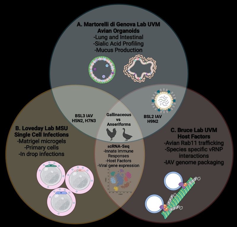 Interrogating IAV infections in primary duck and chicken gut and lung cell organoid models. Migratory aquatic birds serve as the natural reservoirs of IAV, and their co-evolution has led to the emergence of novel influenza strains that can cause high levels of morbidity and mortality in other hosts. The emergence of new strains of IAV poses a significant threat to public health including the currently circulating highly pathogenic avian IAV H5N1 strain (clade 2.3.4.4b) which has resulted in multiple spillover infections in terrestrial and marine mammals. However, despite the pivotal role played by birds as the natural reservoir of IAV, and as incidental hosts that can facilitate mammalian infection, there is an absence of reliable cell culture models for studying IAV in domesticated and aquatic birds. This research project is focused on establishing a set of novel primary and organoid cell models from duck and chicken respiratory and intestinal tissue to study differential pathogenesis of avian IAV infections. This work is a collaboration with Drs. Emily Bruce and Bruno Martorelli di Genova at the University of Vermont (UVM) and will allow us to address fundamental mechanistic questions about avian IAV infection in natural and incidental avian hosts.