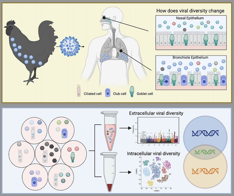 Characterizing evolutionary processes of mutation and selection that contribute to virulence and transmission of viral pathogens. Avian IAV is an extraordinarily adaptable virus, capable of infecting a wide variety of animal species, including poultry, humans, pigs, and others. Zoonotic spillover into humans with avian IAV subtypes, such as H5N1, has led to illnesses with mortality rates as high as 60%. These spillover events remain rare due to host restrictions that limit efficient viral replication and human to human transmission. However, new pandemic IAV strains can arise when viral evolution results in host adaptation that facilitate human to human spread. This research project focuses on using drop-based microfluidics to evaluate novel evolutionary landscapes and adaptive trajectories of avian IAV viral populations at the single cell level, allowing for better modeling of virus evolution and adaptation. We are working on characterizing both extracellular and intracellular viral diversity with next generation sequencing techniques following infection of human primary nasal and bronchial epithelial cells. Studies are focused on avian IAV strains that maintain pandemic potential within the natural environment, including the strains currently infecting dairy cattle.